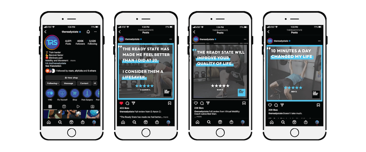 While working as a Graphic Designer for Inkwell Media, I was given the opportunity to create the social media graphics for The Ready State. The Ready State is a fitness and mobility business. TRS had a significant online presence and had a competitive edge by being able to sell their product via video courses and tutorials. For that reason, online testimonials became an integral part of the brand’s success. My primary task was to create social media-friendly graphics for online testimonials and special promotions.